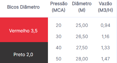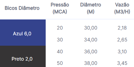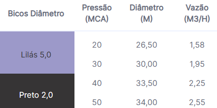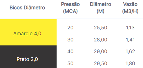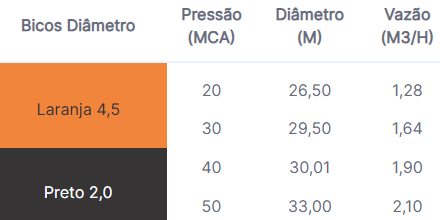 - Vazões e alcances variados de acordo com o bico utilizado